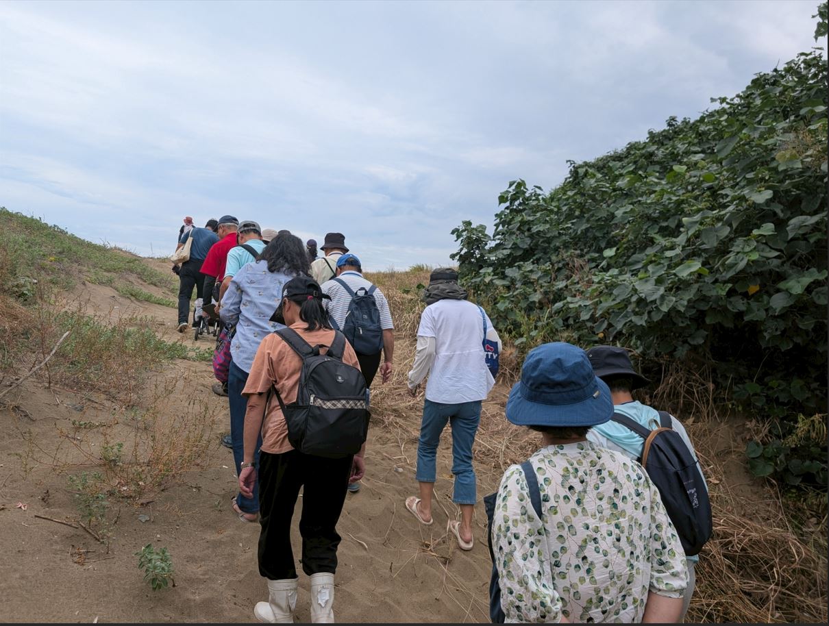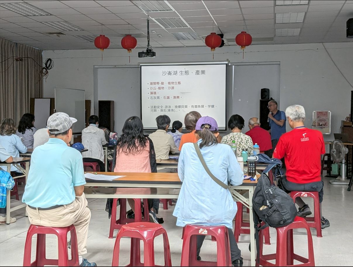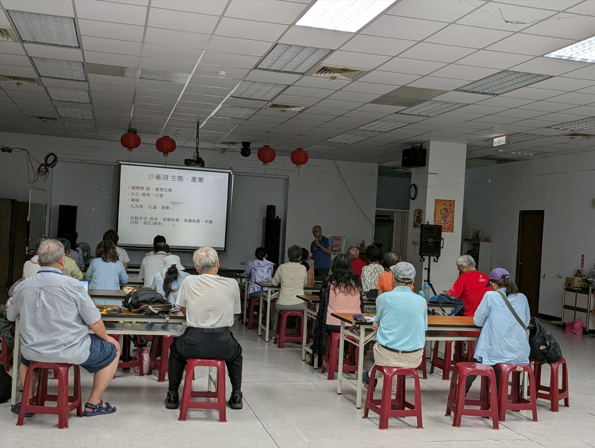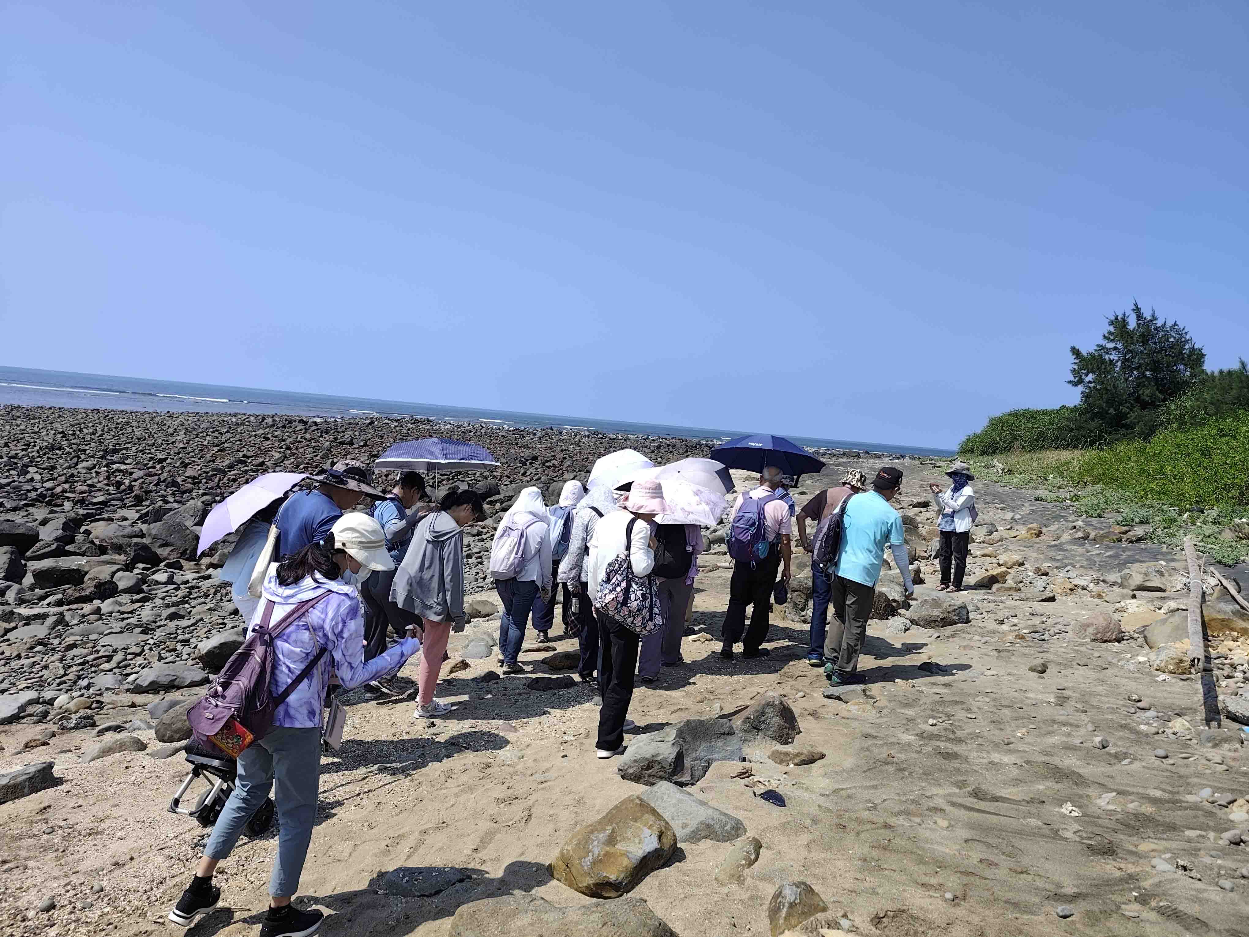 老師先說明牛車寮在北海岸的位置,地質景觀火山地形有火成岩和沉積岩,以及洋流的走向如黑潮主流、支流,其次講解牛車寮信仰文化,早期歷史: 包括十八王公、八仙宮、八里媽祖天后宮,龜吼順天宮...,漁船巡海,再則荷蘭入侵也有關富貴角和麟山鼻記錄等。而後介紹沙崙湖生態和產業如潮間帶動、植物生態、藻礁(咾咕)、燒酒螺、沙丘、石滬的風貌,永安海螺館…等學員都收獲滿滿。