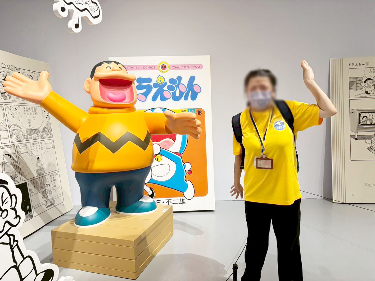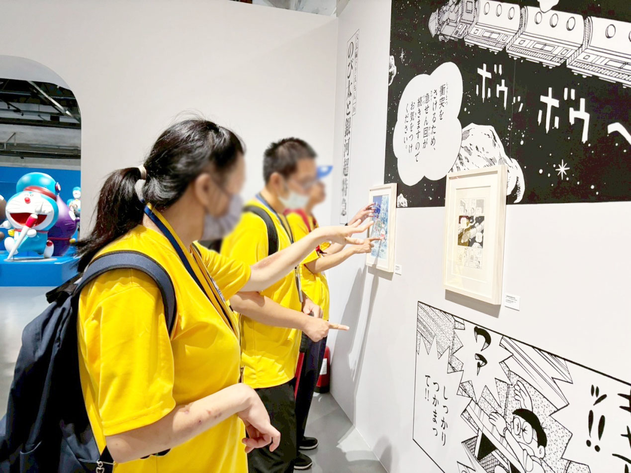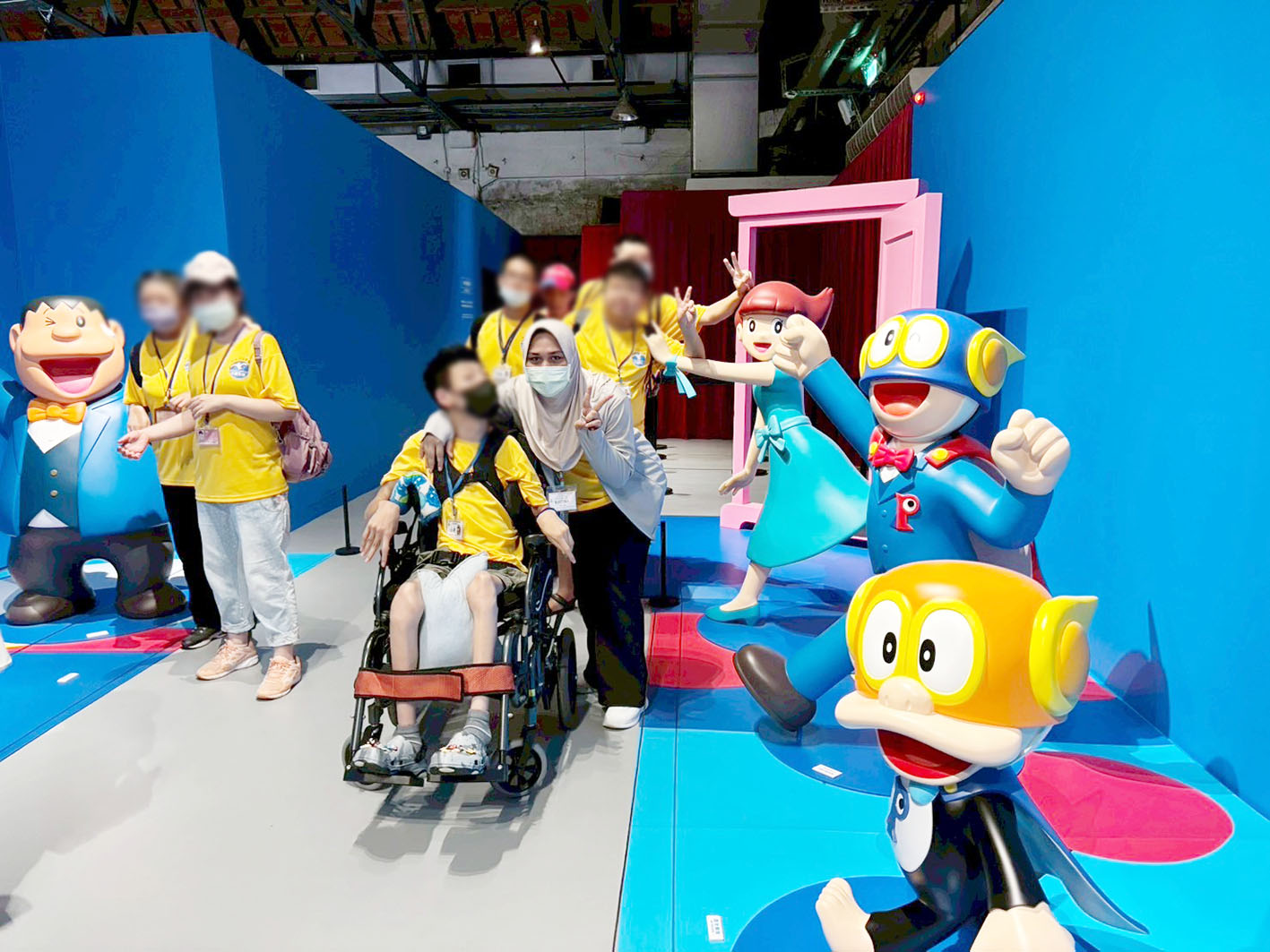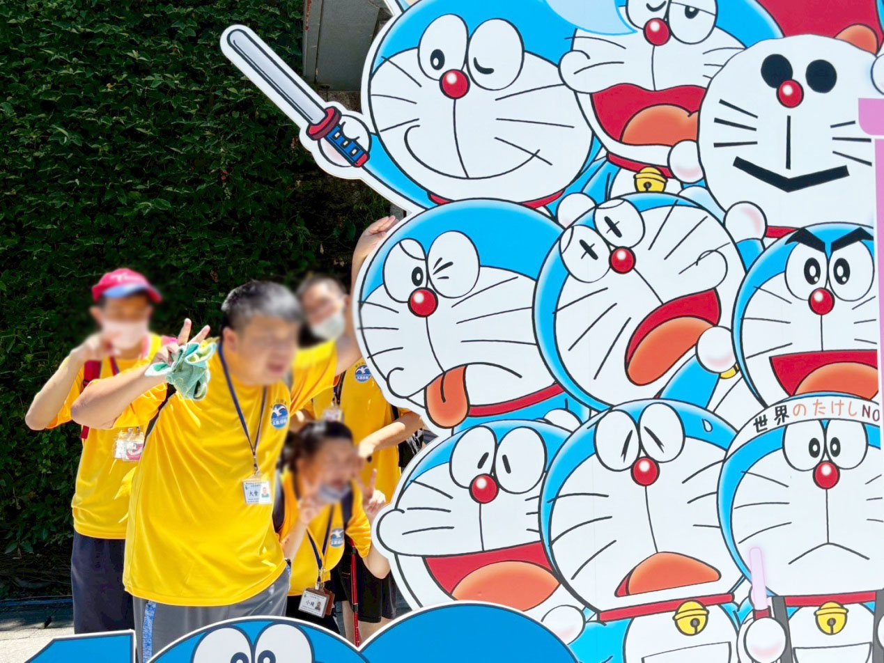 對學員們來說,從認識公車路線、排隊上車、刷卡、找座位,到在陌生環境中保持安全與自信,每一個小小的步驟,都是大大的成就。來到展場,映入眼簾的就是可愛的哆啦A夢人偶,一排排笑臉迎接大家,學員們立刻興奮地喊:「哆啦A夢!」。在場館裡,我們走進一個個熟悉的場景:時光機帶大家回到童年,坐上去就像要開始一場冒險;任意門粉紅亮眼,學員們一個個開心排隊「穿越」;道具展示區裡,有竹蜻蜓、縮小燈、記憶吐司,每個都是滿滿的回憶;最吸睛的還有巨大的哆啦A夢公仔,工作人員把握機會幫學員們合影留念,大家臉上的笑容比道具還要閃亮。整個展覽空間色彩繽紛,背景音樂播放著熟悉的旋律,讓人彷彿真的走進卡通世界。學員們不僅看得入神,更在過程中學習如何耐心排隊、遵守規範、與人互動。生活就是最好的實踐,每一次出門,都是自我成長的開始,讓這段旅程充滿溫暖與快樂。歡迎更多家屬與社會大眾一起支持日間照顧服務,陪伴身心障礙朋友走進社區,看見廣闊的世界!