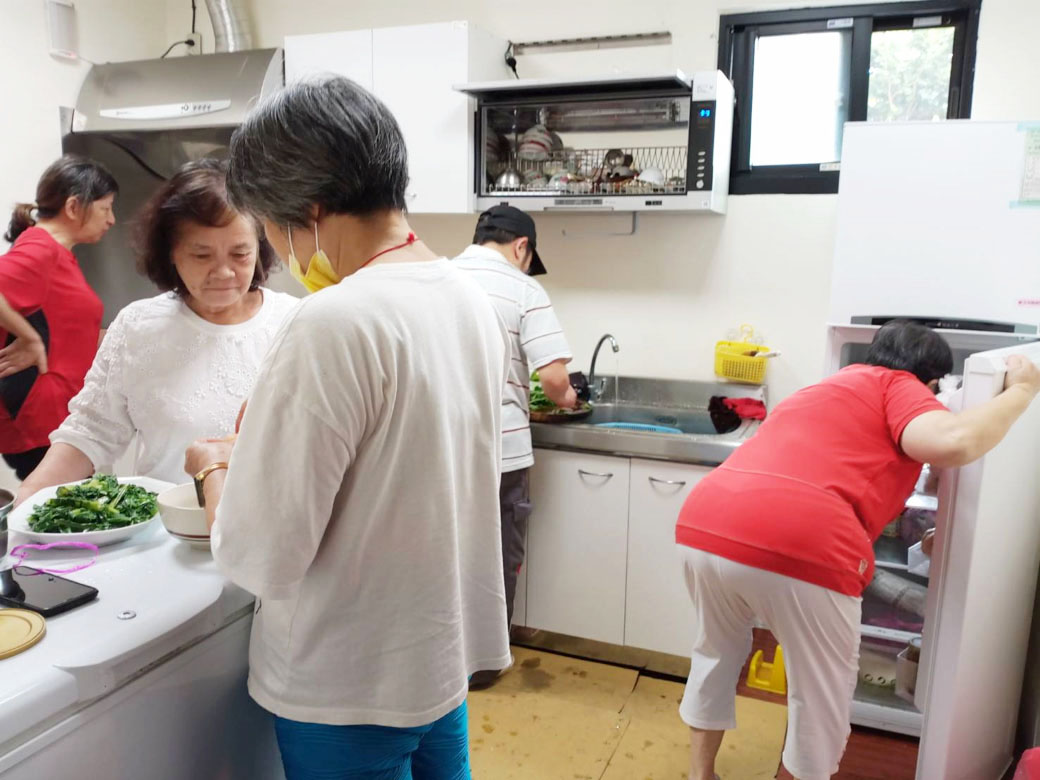 據點裡有好幾位都是擅長烹飪的老手,前一天可能有需要前置作業,也都是分工合作,沒進廚房的長輩也是幫忙整理青菜,好多長輩都是因為有金山馨窩,才能吃到很多的料理,尤其是古早料理,每個長輩的配菜和烹飪方式不同,吃飯的時候總是引起熱烈的討論,所以常常下一次就是換一個人煮她記憶中的料理,日積月累之下,大家的廚藝也日益增長,對沒下廚的人更是收穫滿滿,不但吃的滿足也增長見識。