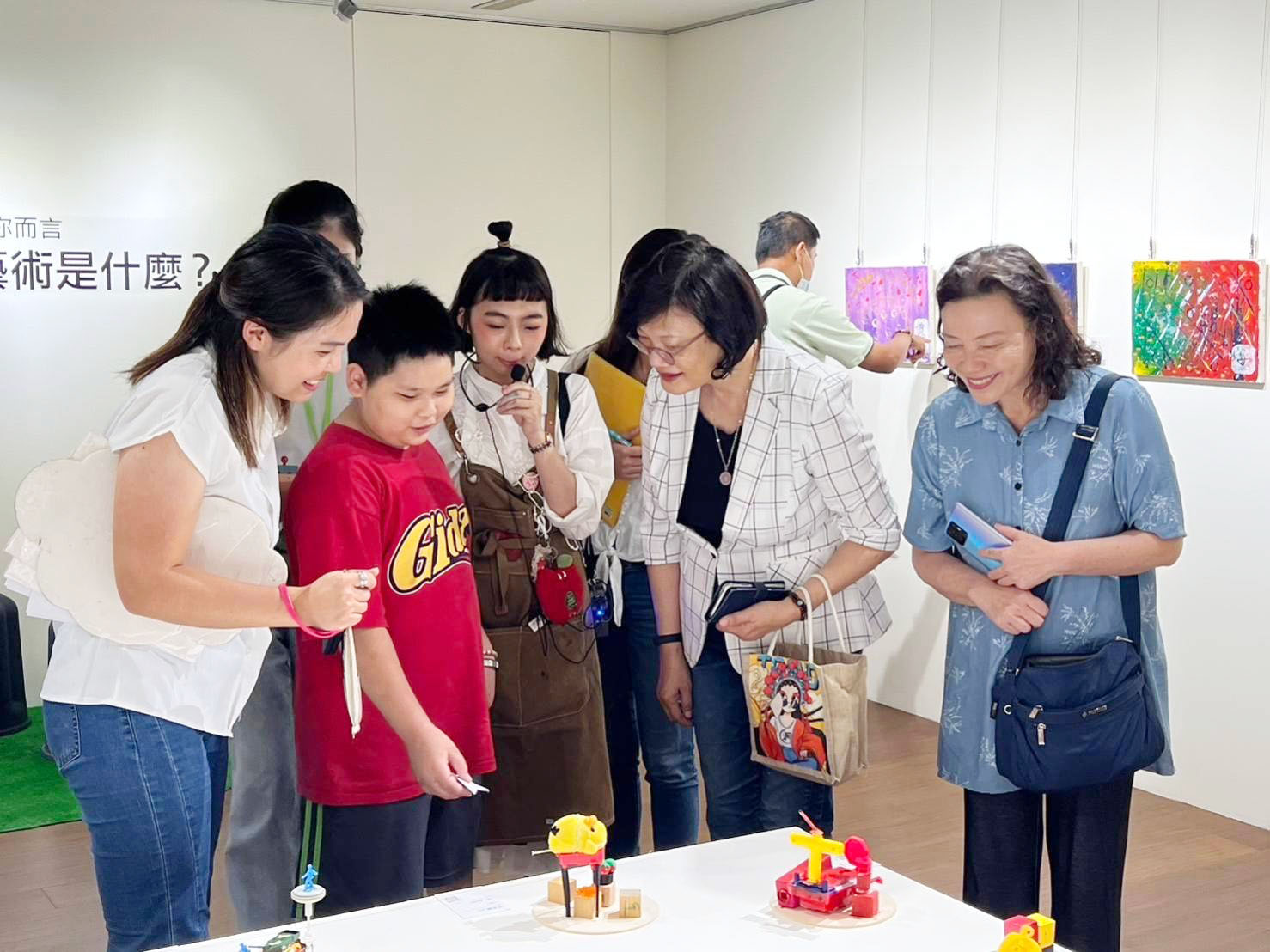 阿公阿嬤或兒少拿著玩具沾上染料在畫布上作畫,車輪滾過去就是一幅幅美麗的風景。積木不僅可以蓋城堡,還能堆疊蓋在紙上成為小屋。有孩子利用舊玩具創作烤肉架,架上還有一隻雞,說是用來中秋烤肉。小朋友的創意令社會局長李美珍和新生活促進會創辦人羅素如等人嘖嘖稱奇。