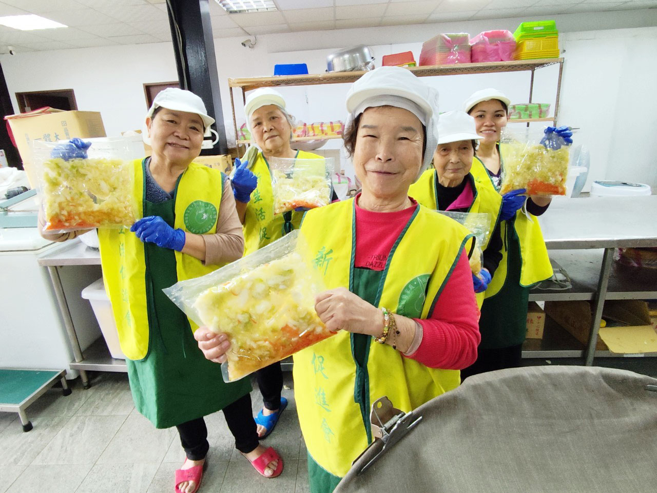 ~泡菜 泡菜 不是什麼大菜 泡菜 泡菜 只是一盤小菜~配合著高凌風的歌聲,萬歲志工的長者們紛紛挽起袖子,分批來到中央廚房做泡菜。從切、剝、洗、瀝乾、入鹽醃製、翻動搓揉、秤重裝袋、加糖醋醬汁、封口,即完成清甜爽口的泡菜製作,靜置兩天入味後即可開封食用,有些長者雖是第一次製作泡菜,但依協會餐點資料庫的標準流程,以及珍媽同仁的從旁協助下學會了泡菜的製作,當長者們拿著自己親手製作的泡菜合照時,每個人的臉上都洋溢著滿滿的成就感。