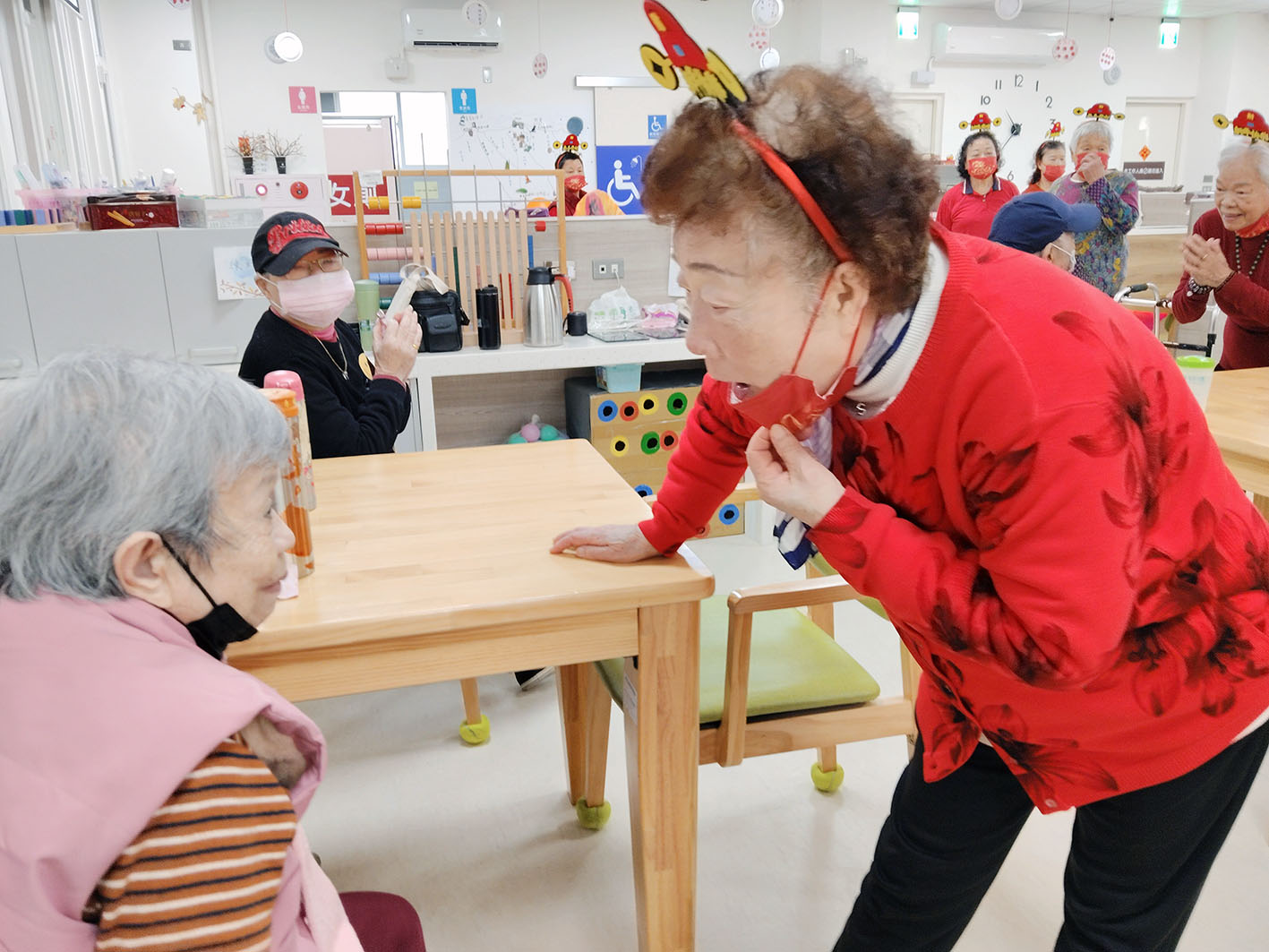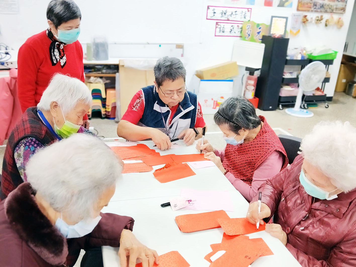 今年寶貝們特別送上不一樣的巧思與祝福,在活動前夕,齊聚一堂由高齡84-92歲五位長者親手在紅包袋上書寫「福」字,並由其他長輩將象徵甜蜜、幸福、健康與祝福的糖果一一裝入紅包袋中再加以包裝及裝飾,願大家新的一年都福氣滿滿。